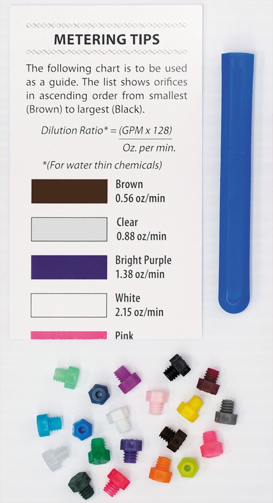 ● The final dilution ratio produced by each tip varies based on the water volume (GPM) and pressure (PSI) flowing through the Venturi body of the specific unit being installed